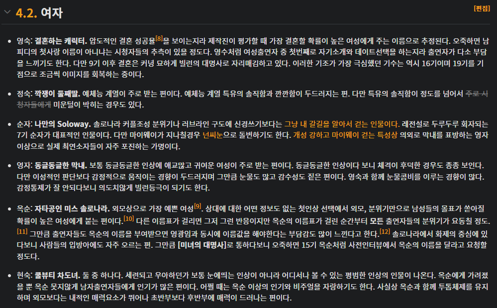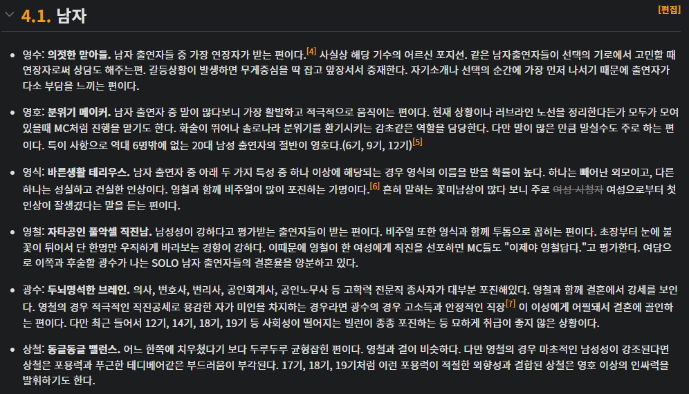 그리고 케릭터 들이 가명별 성격들이 매 시즌 비슷한 사람들 끼리 어떻게 이렇게 매칭을 했지?