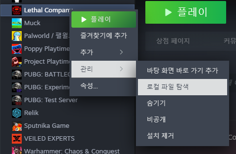 ⑤ 스팀의 라이브러리에서 리썰컴퍼니를 선택하고 마우스 우클릭을 합니다.