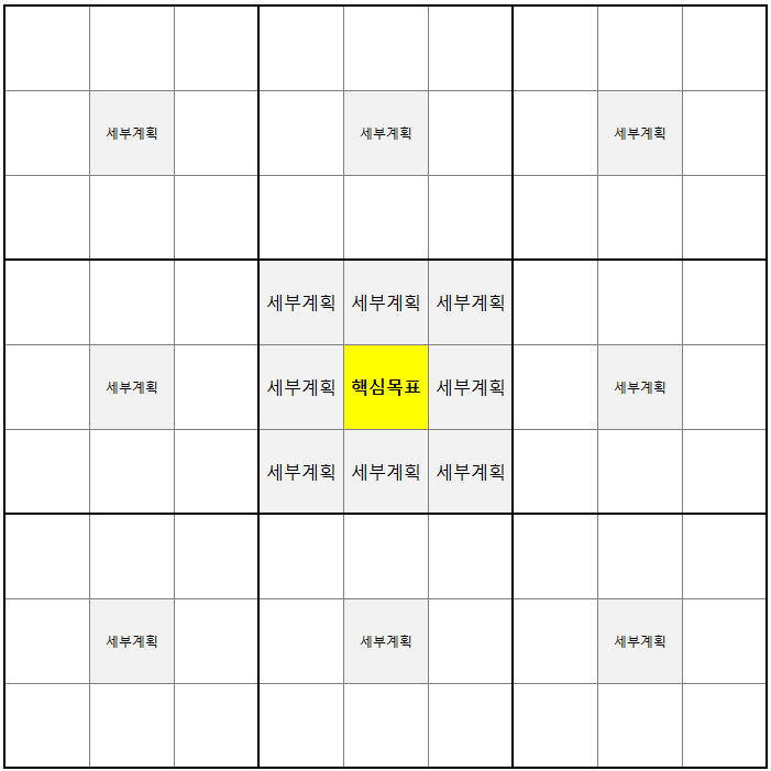 결론부터 말씀드리면, 만다라트는 가장 핵심이 되는 목표를 중심으로 세부적인 실천 계획을 거미줄처럼 확장해 나가는 목표 달성 도구입니다.