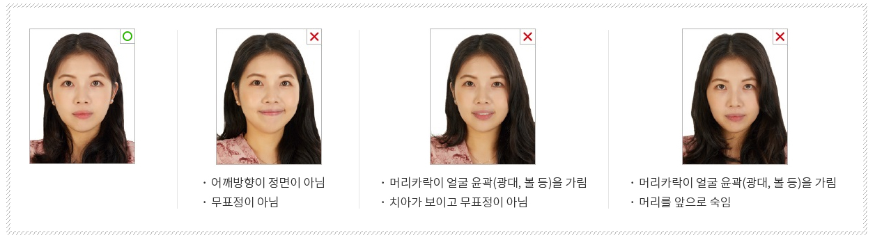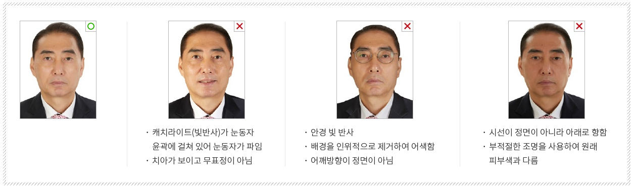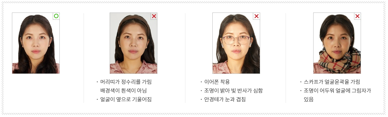 - 안경 및 렌즈: 색이 들어간 미용 렌즈나 선글라스는 착용 불가입니다. 안경 착용자라면 뿔테안경처럼 테가 두꺼워 눈이나 눈썹을 가리거나 그람자가 생기는 안경은 피하고, 얇은 테의 안경을 쓰거나 벗고 찍는 것을 권장합니다.
