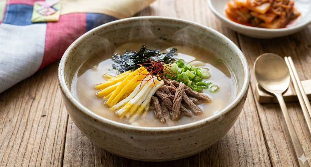 - 재료 준비 (3~4인분 기준): 떡국떡 400g, 준비한 소고기 육수 1.5L, 찢어둔 소고기 고명, 달걀지단(황/백 분리), 대파 약간, 김 가루, 국간장 1큰술, 소금 약간.