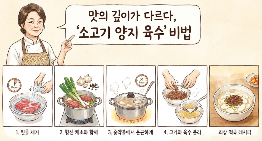 떡국의 생명은 국물입니다. 시판 사골 육수를 사용해도 좋지만, 정성을 담은 구정맞이 최상 떡국 레시피를 위해서는 직접 소고기 양지로 육수를 내는 것을 추천합니다. 깊고 구수한 맛이 차원이 다릅니다.