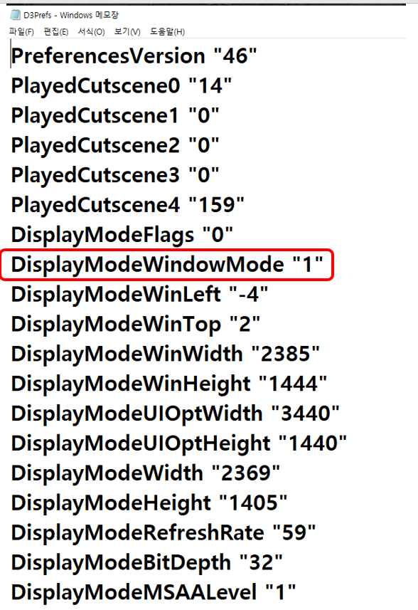 간단히 DisplayModeWindowMode "0" 에서 "1"로 바꿔주시면 게임을 실행했을 때, 창모드로 전환이 되어서 나옵니다.