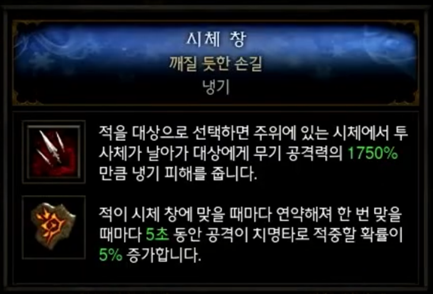 - 시체 창 - 적을 대상으로 선택하면 주위에 있는 시체에서 투사체가 날아가 대상에게 무기 공격력의 1750% 만큼 냉기 피해를 줍니다. 룬으로는 적이 시체 창에 맞을 때마다 연약해져 한 번 맞을 때마다 5초 동안 공격이 치명타로 적중할 확률이 5% 증가하는 깨질 듯한 손길을 선택해 줍니다.