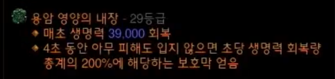 4초 동안 아무 피해도 입지 않으면 초당 생명력 회복량 총계의 200%에 해당하는 보호막 얻음
