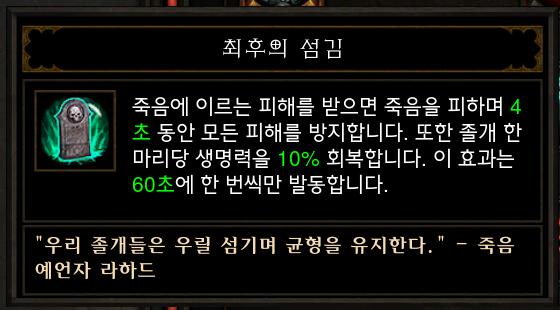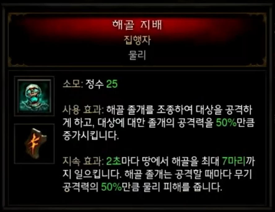 지속효과로는 2초마다 땅에서 해골을 최대 7마리까지 일으킵니다. 해골 졸개는 공격할 때마다 무기 공격력의 50% 만큼 물리 피해를 줍니다.