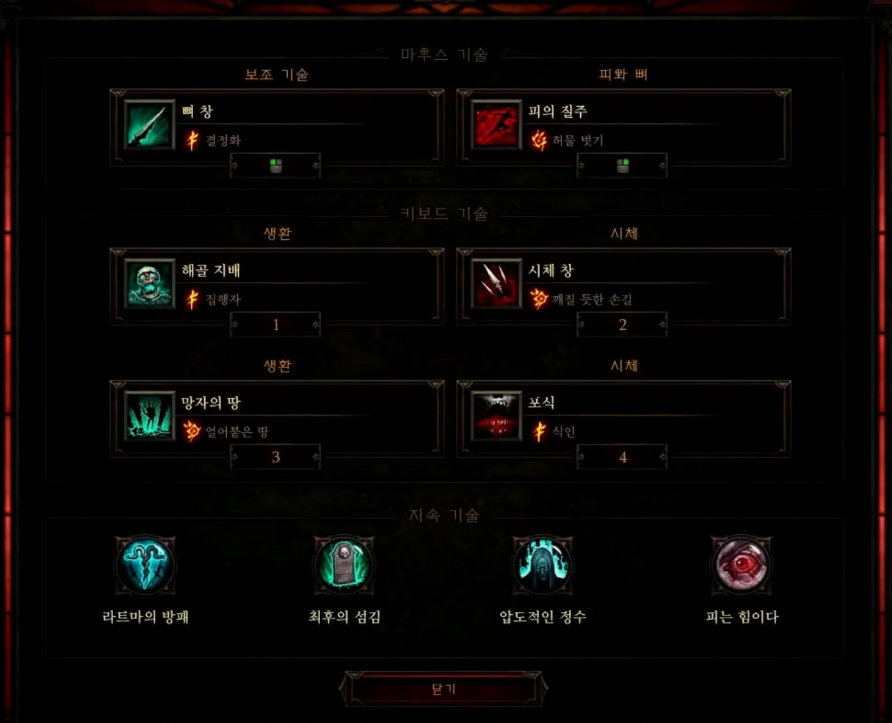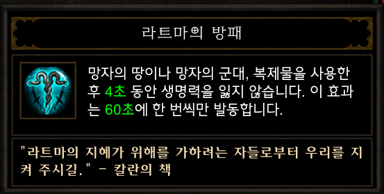 4세트 - 뼈 창, 시체 창, 시체 폭발로 적중시키는 적 하나당 받는 피해가 2%씩 최대 50%까지 감소. 15초 지속
