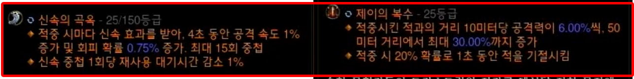 신속 중첩 1회당 재사용 대기시간 감소 1% - 제이의 복수 - 적중시킨 적과의 거리 10미터당 공격력이 6.00%씩, 50 미터 거리에서 최대 30.00%까지 증가