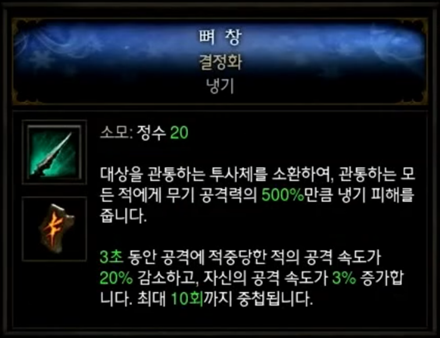 - 시체 창 - 적을 대상으로 선택하면 주위에 있는 시체에서 투사체가 날아가 대상에게 무기 공격력의 1750% 만큼 냉기 피해를 줍니다. 룬으로는 적이 시체 창에 맞을 때마다 연약해져 한 번 맞을 때마다 5초 동안 공격이 치명타로 적중할 확률이 5% 증가하는 깨질 듯한 손길을 선택해 줍니다.