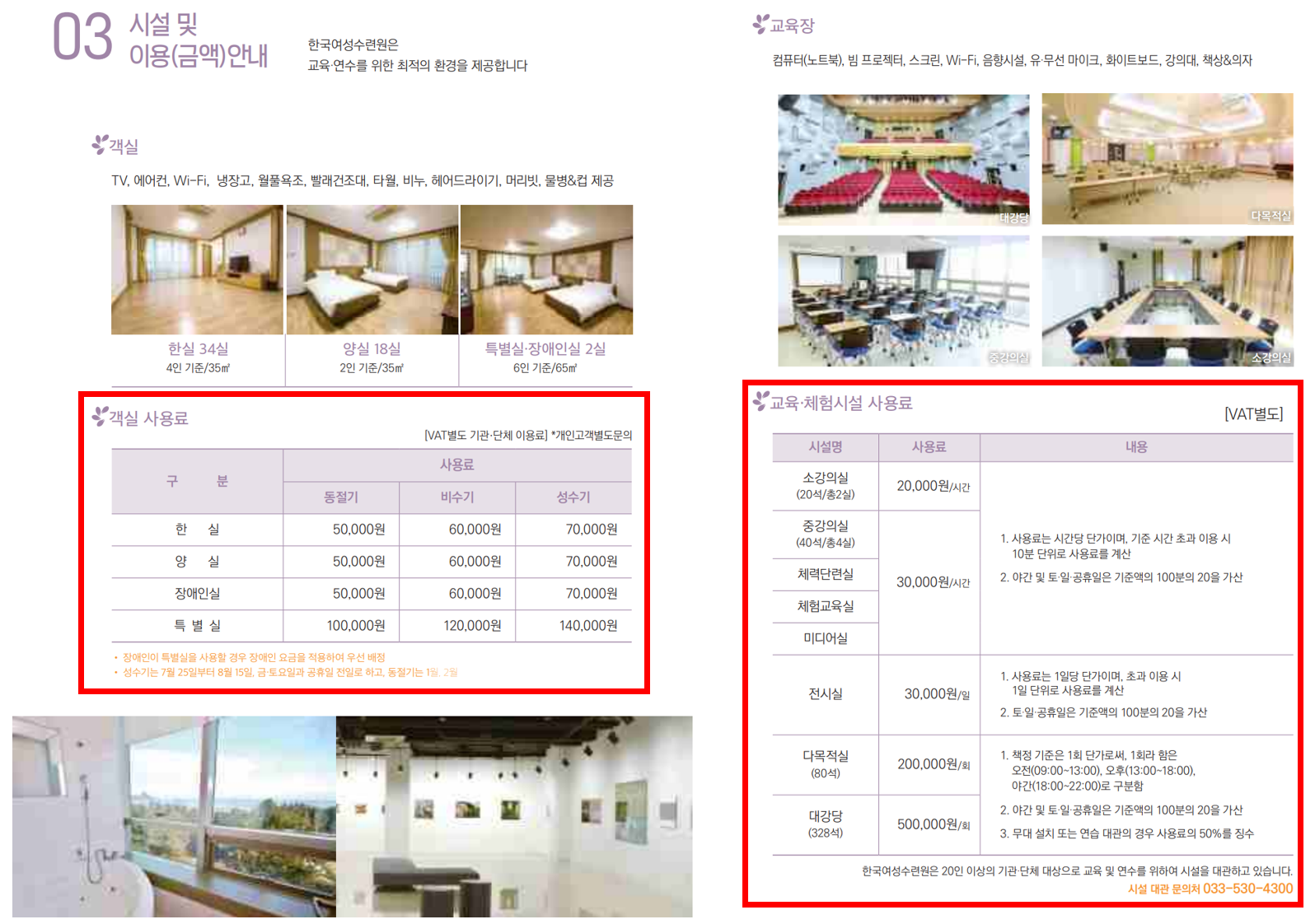 시설 및 이용(금액) 안내