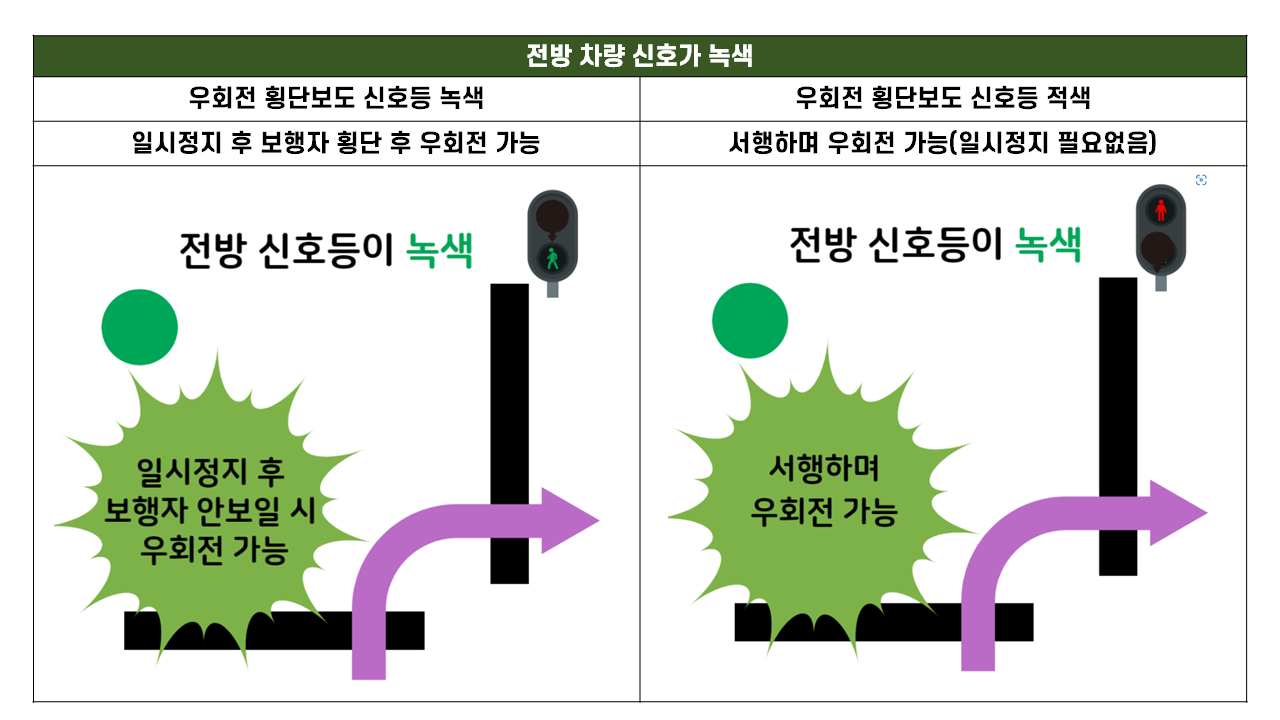 일시정지를 하고 보행자 우선 지나가고 우회전을 합니다. 하지만 우회전 횡단보도에 보행자가 없으면 천천히 우회전이 가능합니다.