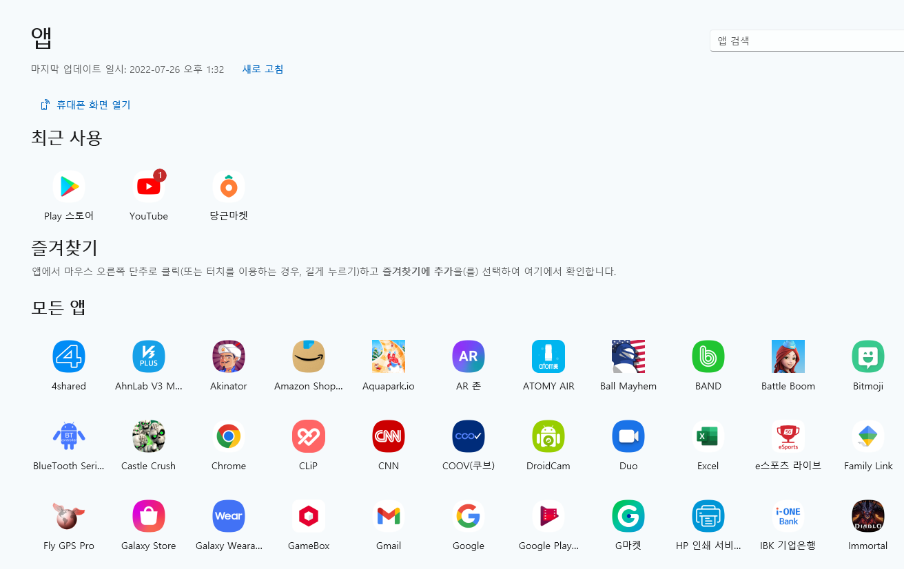 앱의 메뉴에서는 폰에서 사용하는 앱을 동일한 사이즈로 창을 띄워서 실행을 하거나,