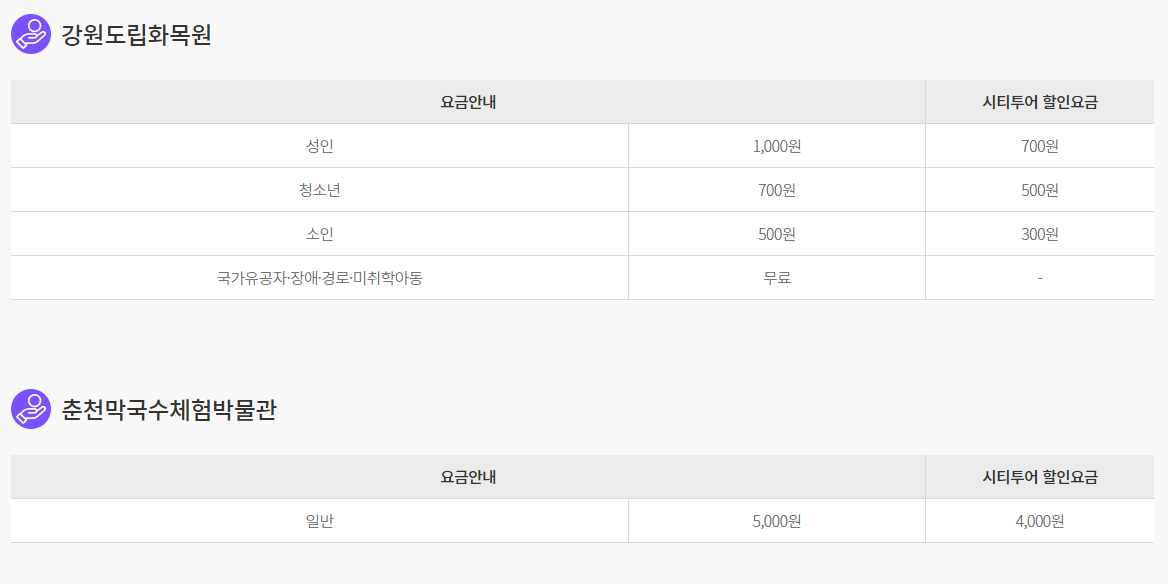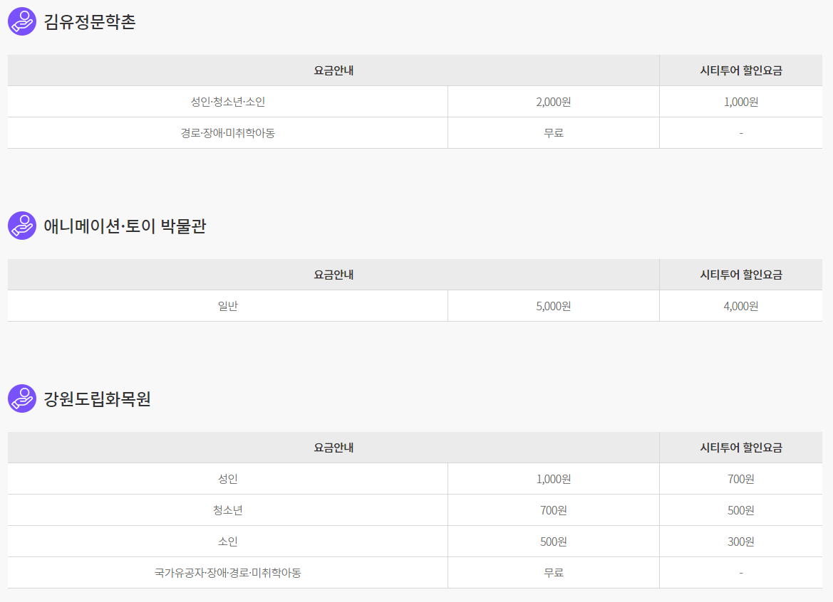 김유정문학촌, 애니메이션(토이박물관), 강원도립화목원에 관람료가 필요합니다.