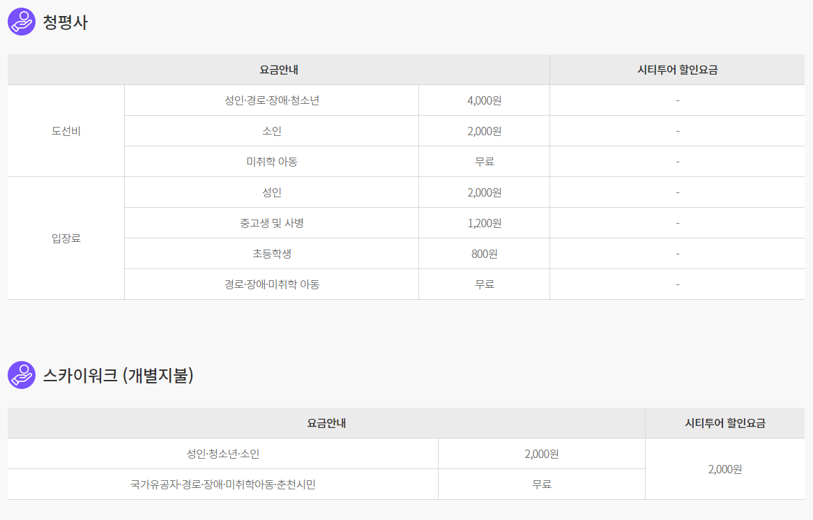 청평사의 도선비와 입장료, 스카이워크의 관람료가 필요합니다.