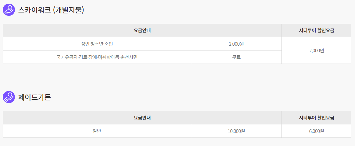 스카이워크와 제이드가든의 관람료가 필요하지만,