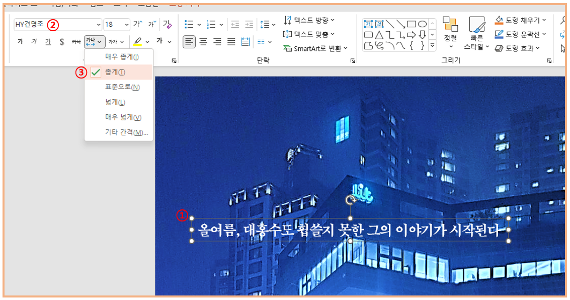 글씨체를 선택을 하고, 글꼴을 선택합니다. 글자간격은 좁게로 설정합니다.