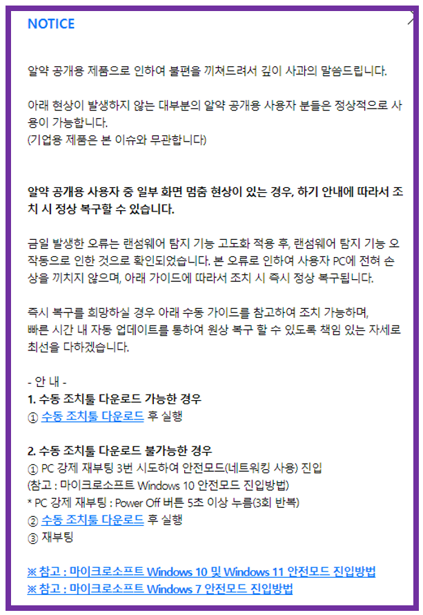 안전모드로 부팅을 하여 수동 조치툴을 다운로드해 실행을 해 줍니다.