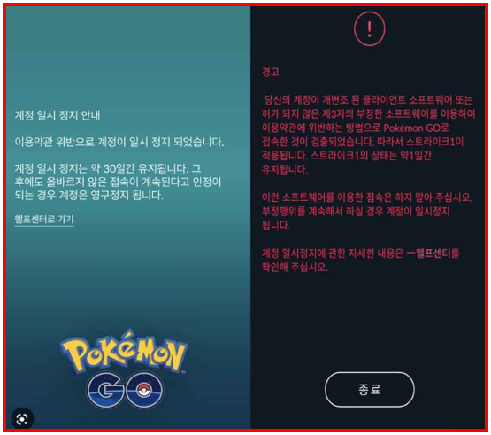 발각(?)이 되면, 포켓몬고 게임에는 접속을 할 수 있으나,