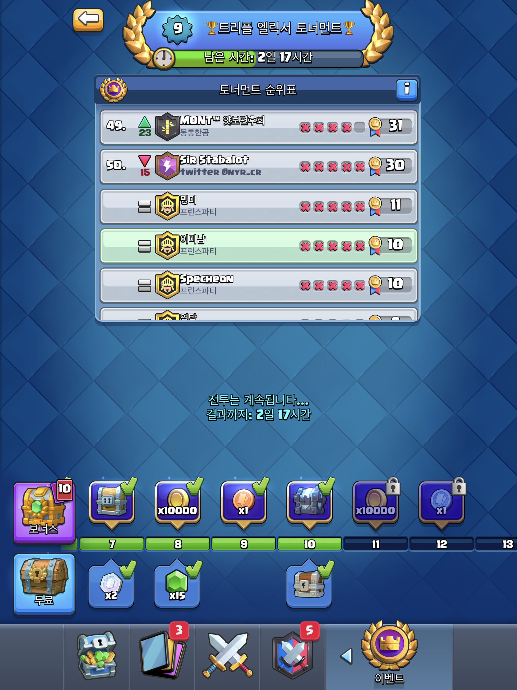 아무도 "클랜전전문 모여라!!" 이 클랜은 관심도 가져주지 않아서, 마침 3주차 클랜전에 2등을 하고 있는 클랜에 클랜원 자리가 많이 남아서 다함께 이주를 했습니다. 3주차 2등 보상으로 50% 확률로 전설카드는 아들 포함 5개의 계정 모두 전설카드가 나왔습니다. ^^;