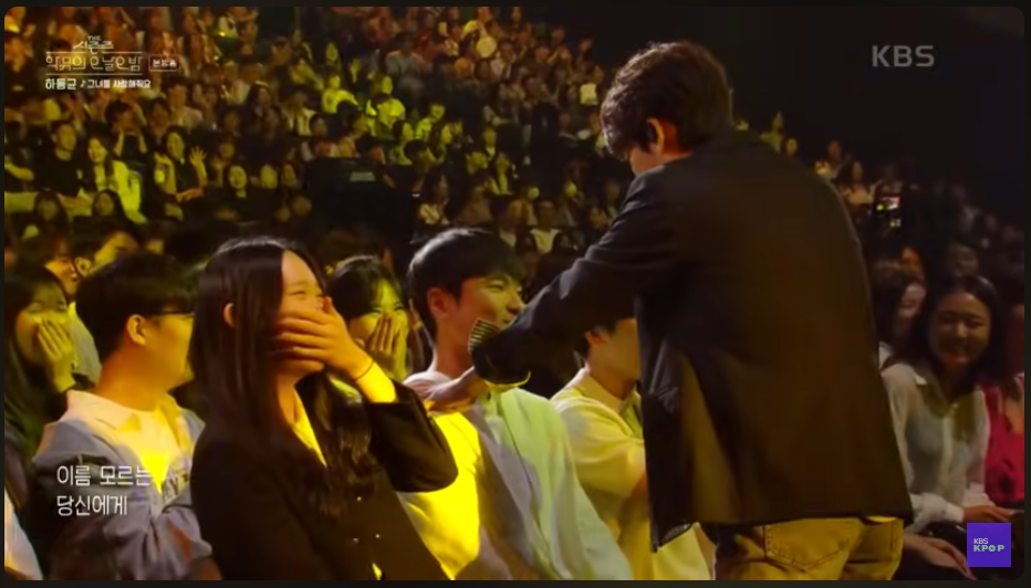 객석에 내려간 뒤, 나를 버리고 간 여자친구를 찾아서, 2절을 계속해서 불러줍니다.