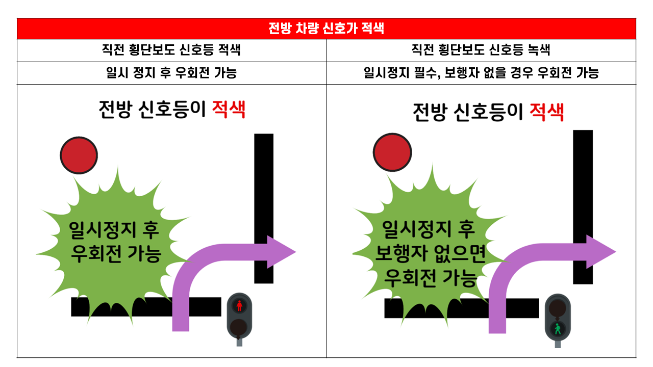 차량 신호등이 적색이고, 차가 우회전하려는 경우 정지선, 횡단보도 및 교차로 앞에서 의무적으로 차를 정차한 후, 지나가는 의무를 에정하고 있습니다. 사고 다발지역에는 우회전 삼색등을 설치 후 신호에 따르는 것도 추가되었습니다.